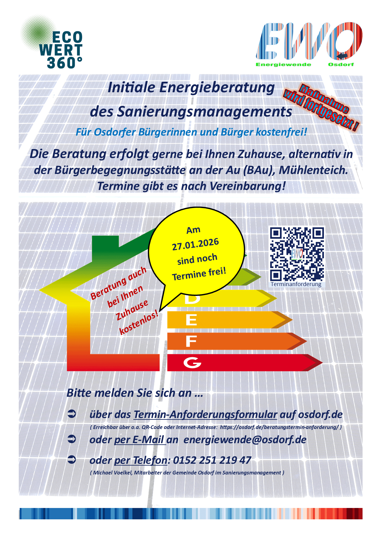 Wir freuen uns, dass wir auch in  den nächsten Monaten initiale Energieeffizienzberatungen bei Ihnen vor Ort durchführen, und weitere Maßnahmen zum Klimaschutz oder zur Klimaanpassung in der Gemeinde Osdorf voranbringen dürfen.  Zudem unterstützen wir die Gemeinde auch weiter gern in der Fernwärmenetzthematik.